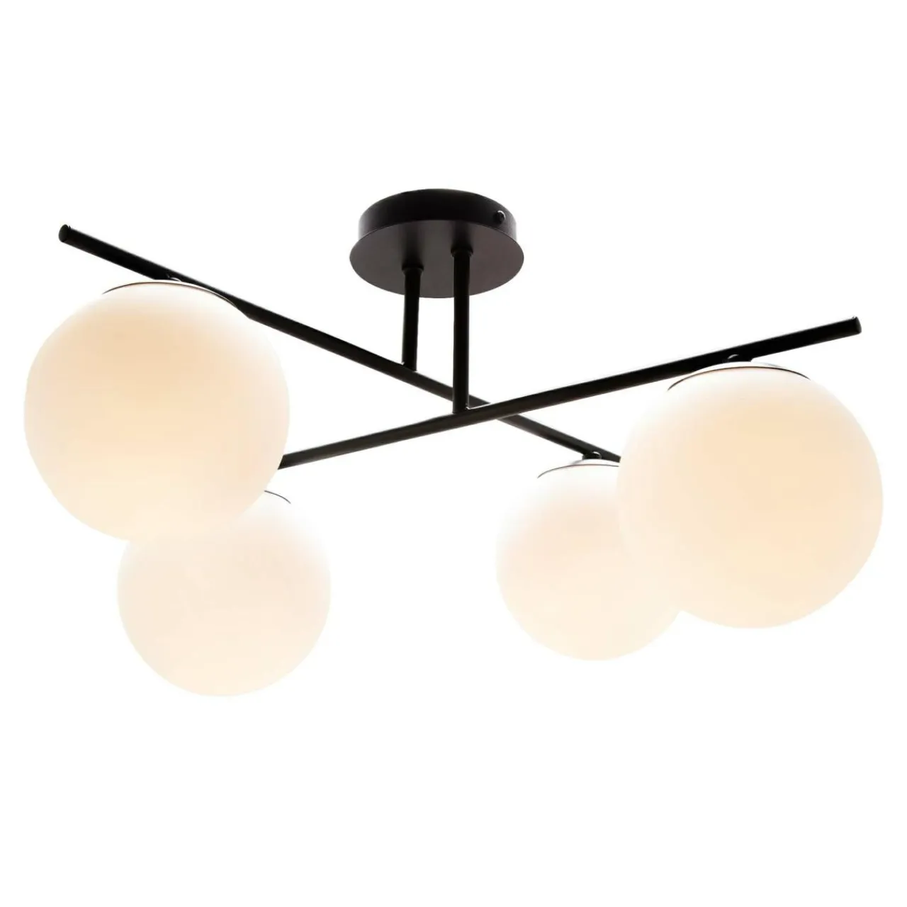 Klosze, które wieńczą lampę są połączone w przejrzysty sposób za pomocą prostopadle połączonych ramion. Mlecznobiałe kule całkowicie osłaniają żarówki, a wykończenie bazy w czarnym kolorze nadaje całości minimalistycznego posmaku i doskonale koresponduje z meblami w odcieniach szarości, czerni i bieli.