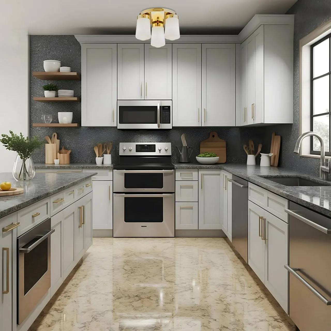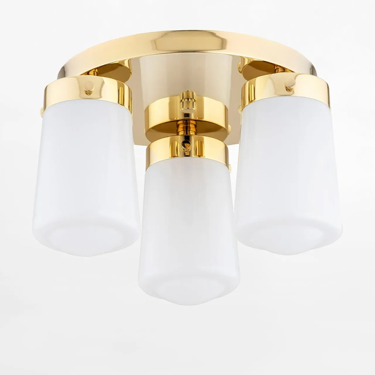 Posiada błyszczące wykończenie w kolorze mosiądzu oraz 3 białe klosze na okrągłej podstawie z miejscem na żarówki typu E27.
