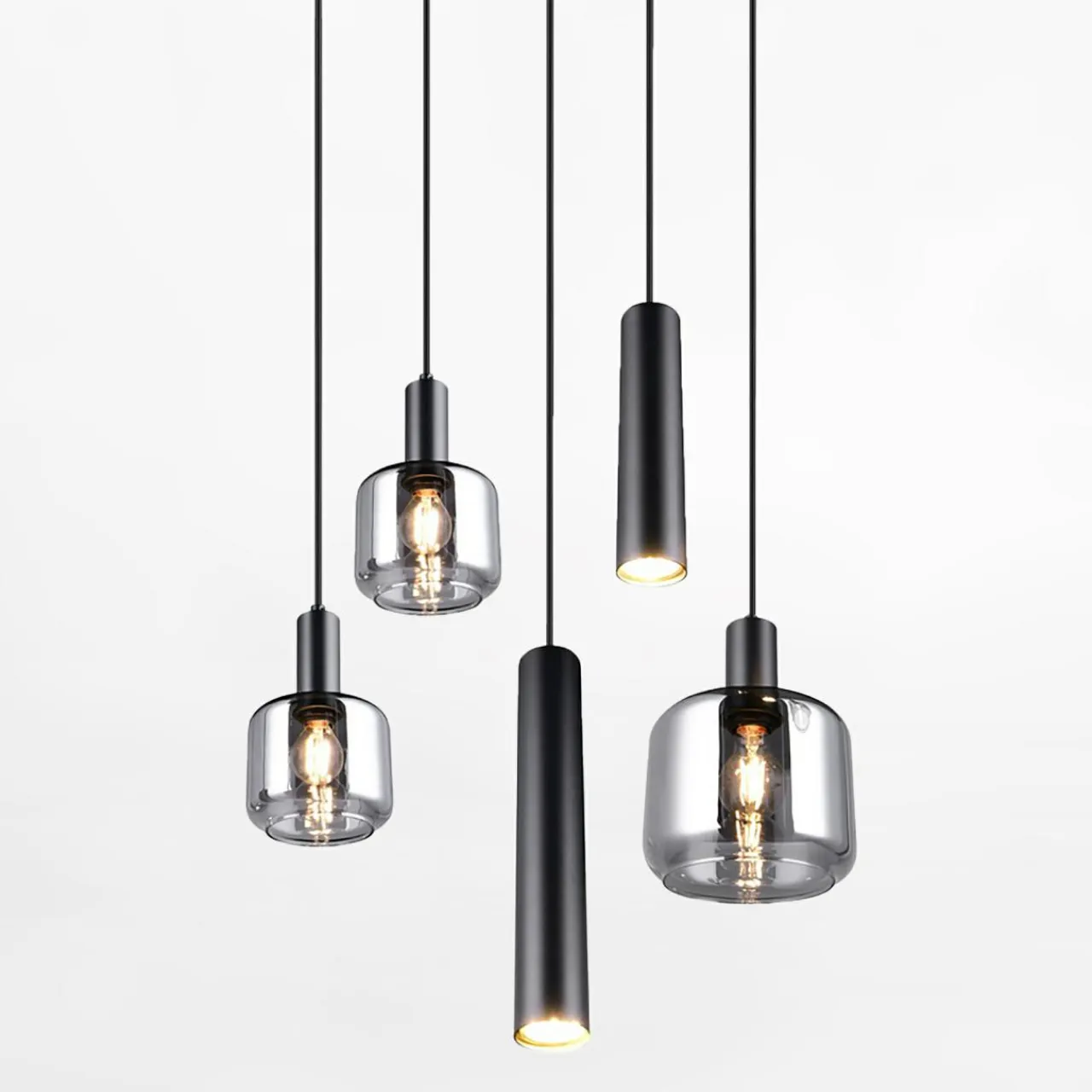 Lampa wisząca MATARO łączy smukłe, metalowe oprawy z szklanymi elementami, tworząc niepowtarzalny efekt światła i odbić.