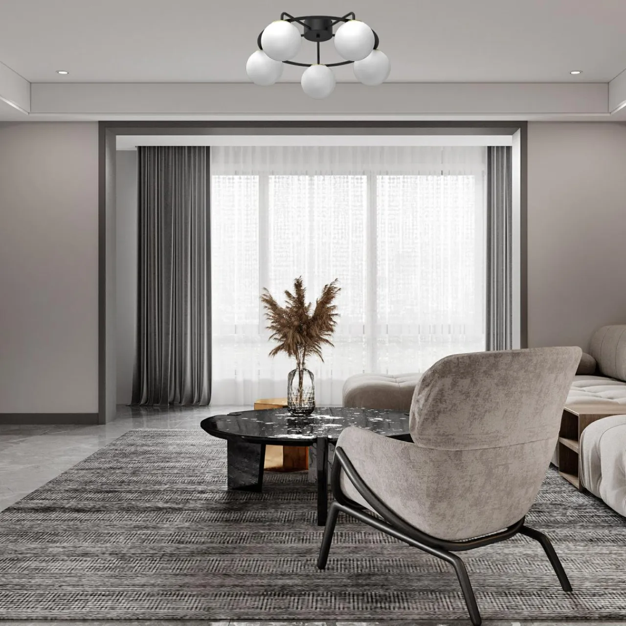 - Zestawienie czarnej oprawy z białymi kulami kloszy idealnie wpisuje się w przestrzeń salonu lub jadalni.