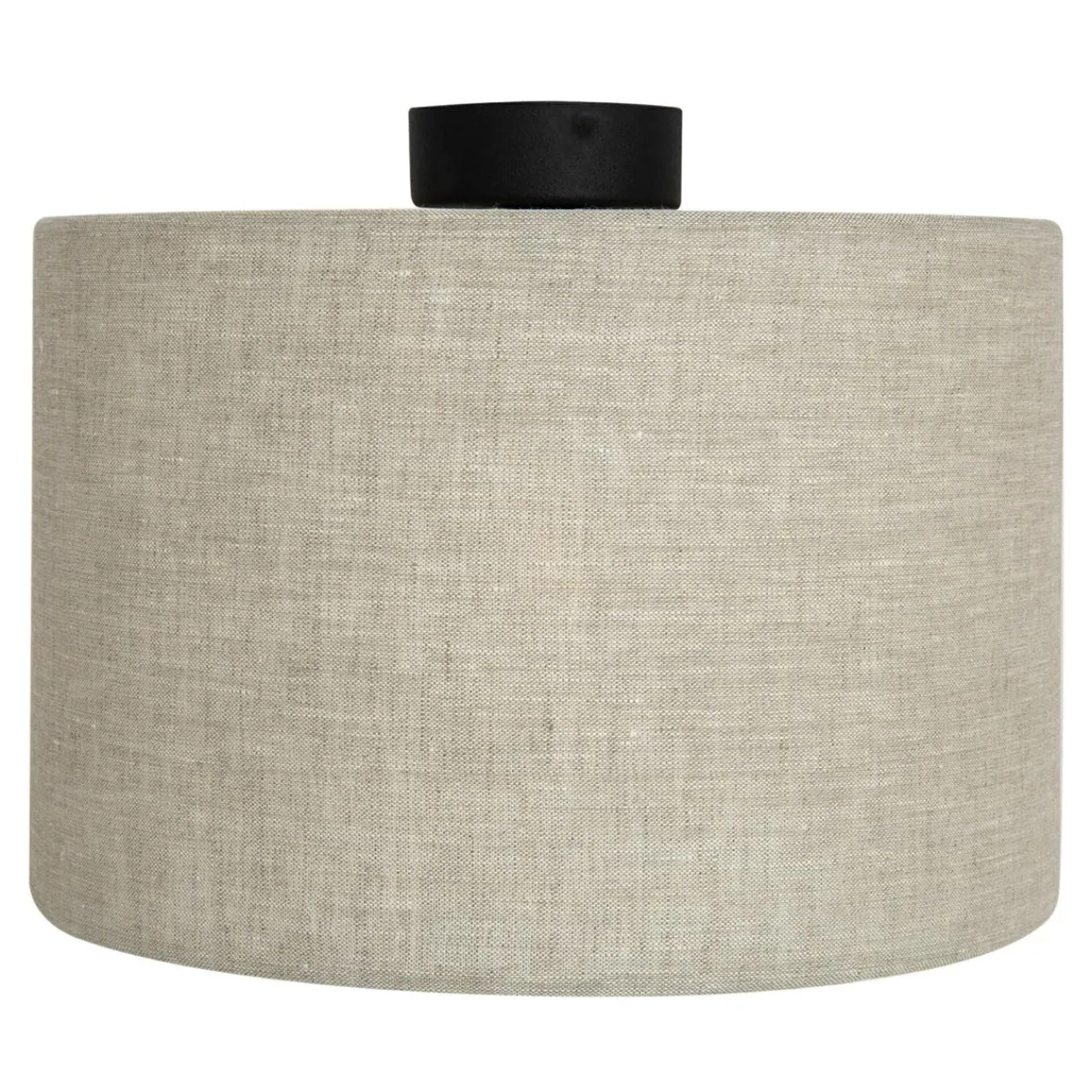 - Największym atutem lampy jest charakterystyczny abażur wykończony lnianą tkaniną z pogranicza szarości i beżu.