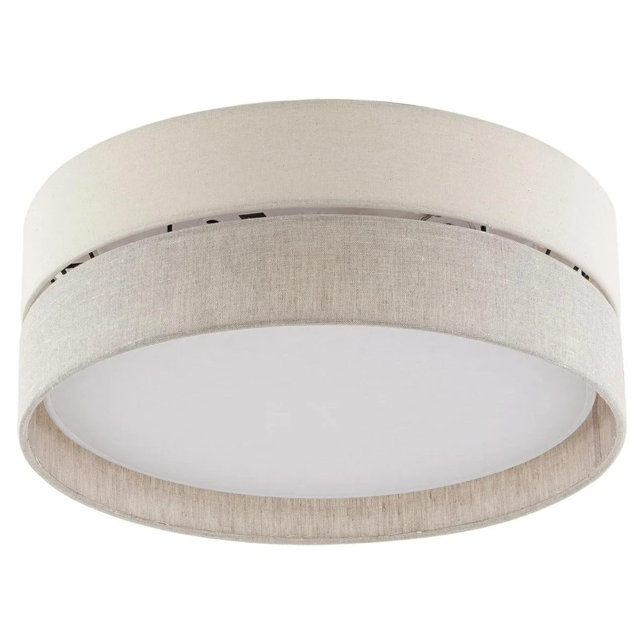 Okrągły abażur lampy ECO został podzielony na dwie części i wykończony dwoma rodzajami tkaniny w ciepłych odcieniach szarości. Tkaniny różnią się fakturą.