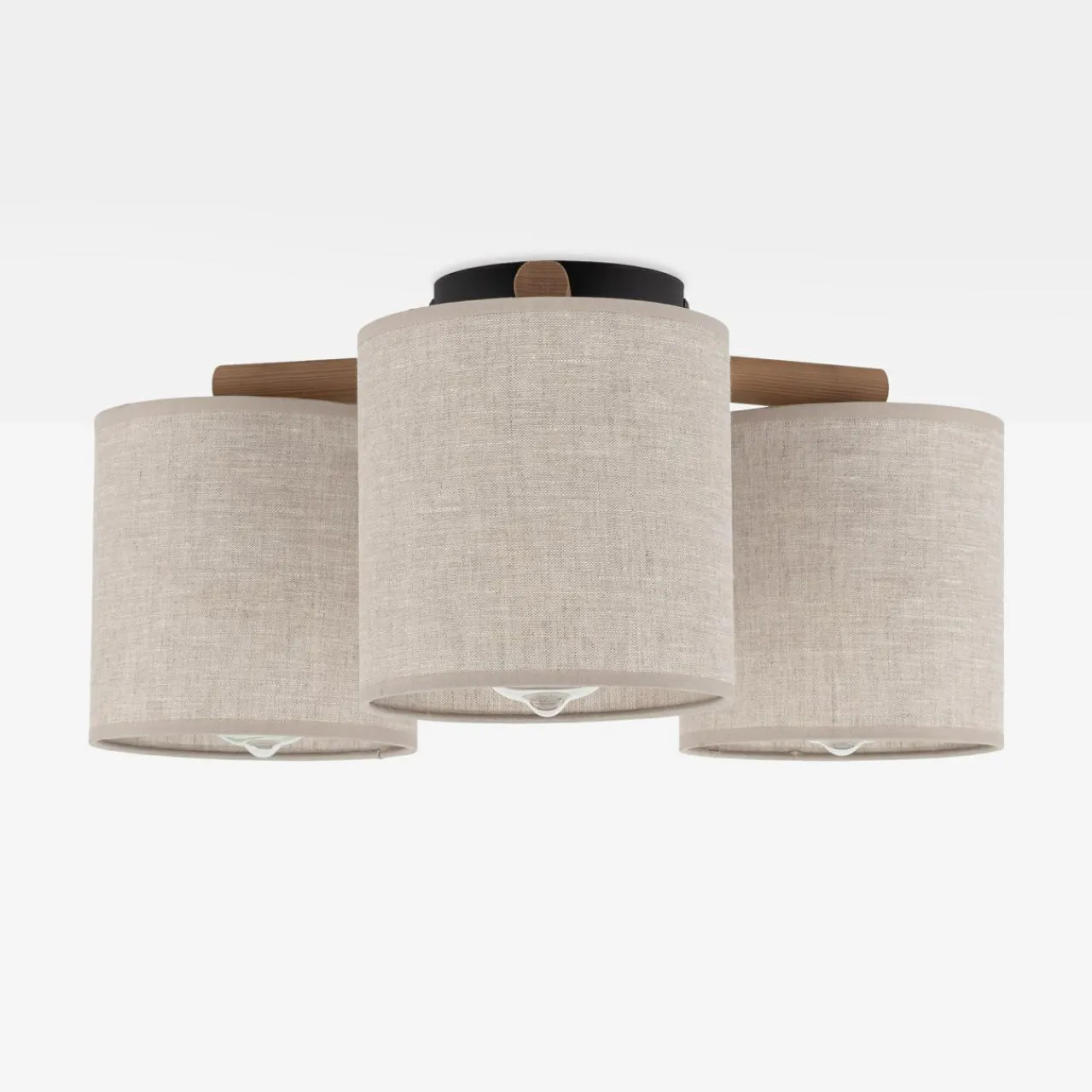 - 3 abażury o kształcie walców zostały dopełnione drewnianą listwą w kolorze dębu, która podkreśla kolorystykę natury.