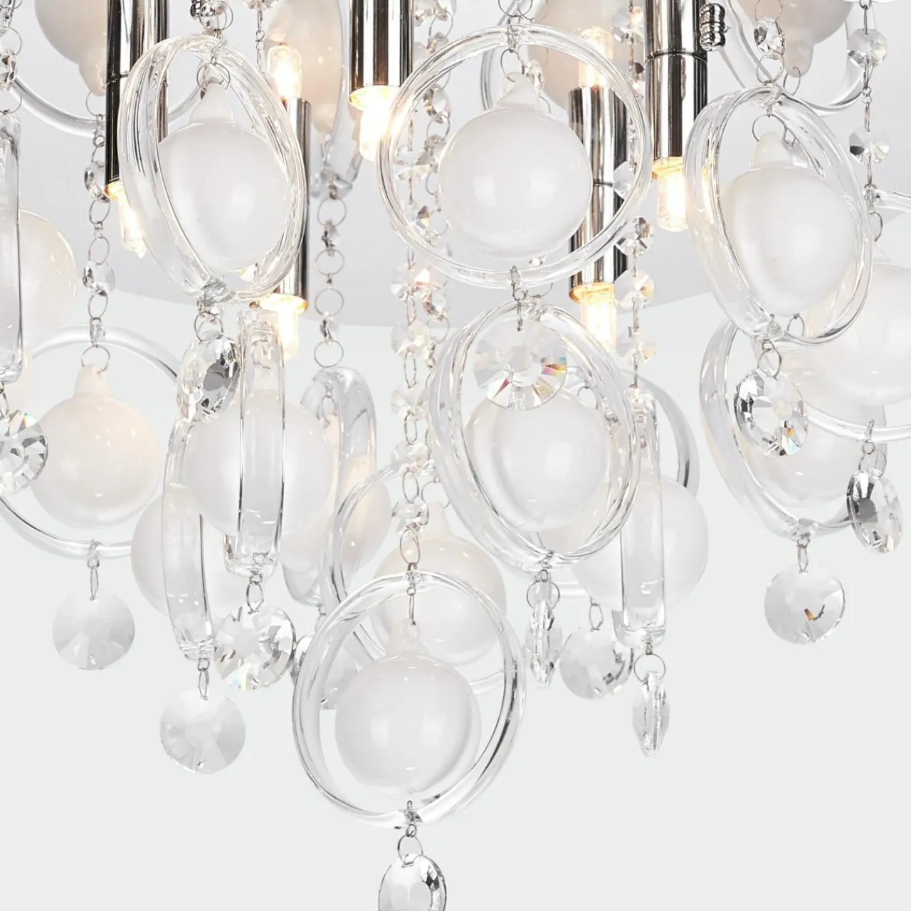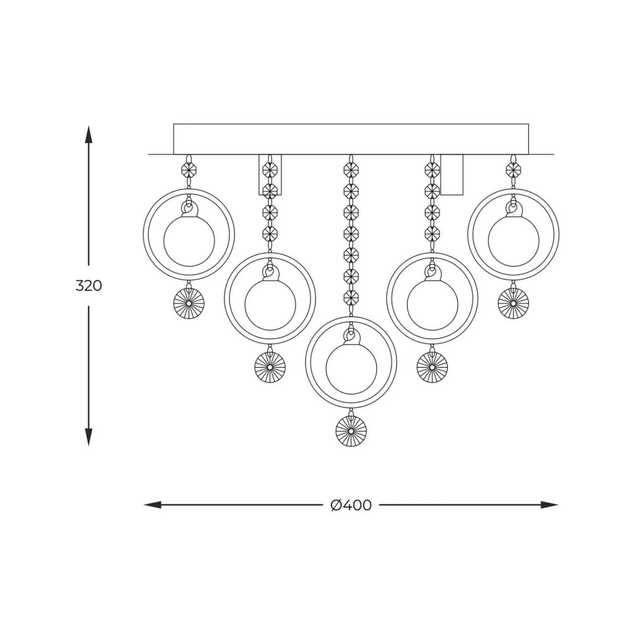 Metalowa podstawa lampy montowana na suficie posiada oprawę przeznaczoną dla pięciu żarówek typu G9 o mocy maksymalnej 25W. Szklane ozdoby uformowane na wzór mniejszych i większych paciorków tworzą ozdobną osłonę, która po zapaleniu światła skrzy się urokliwie ozdabiając pomieszczenie refleksami.