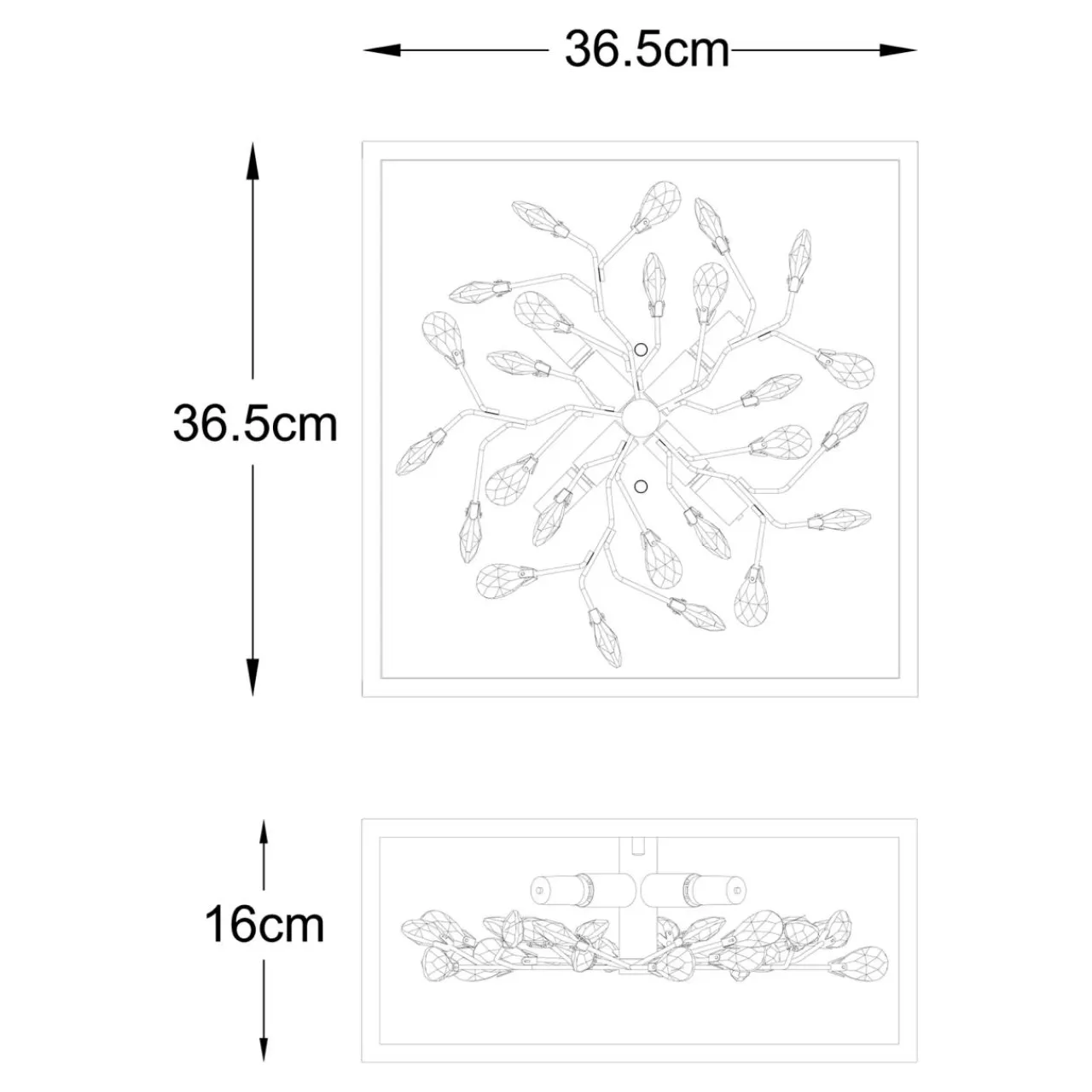 Wiosenna oprawa lampy stylizowana na kwitnącą gałąź podkreślona została akrylowymi kryształkami i zamknięta w prostej, geometrycznej formie oprawy.