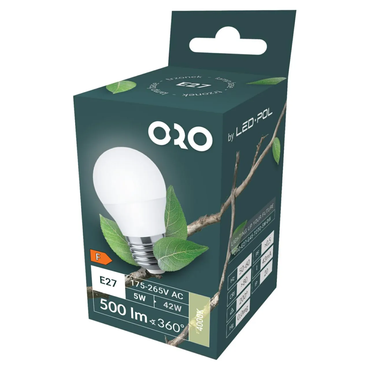 Żarówka ORO-E27-G45-TOTO-5W-DW emituje światło o neutralnej barwie – 4000K i strumieniu 500 lumenów. Jest najbardziej zbliżone do światła dziennego. Doskonale nadaje się do pomieszczeń związanych codzienną aktywnością.