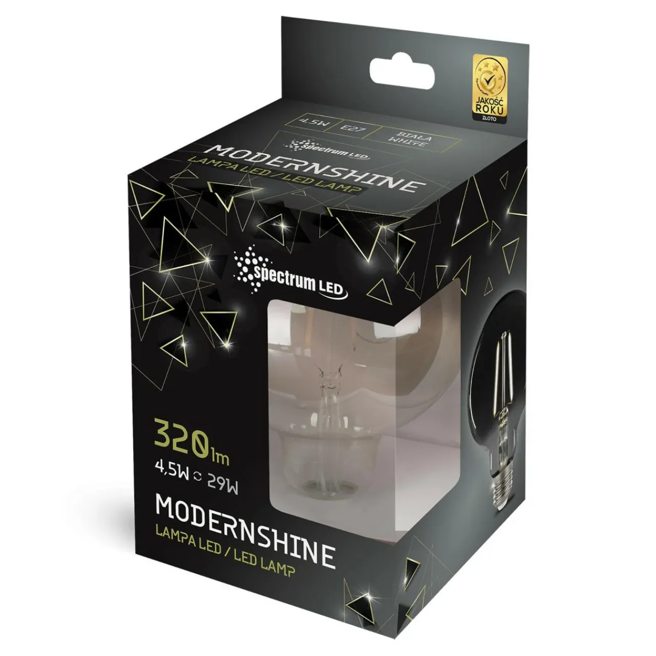 Żarówka LED SPECTRUM 4,5W przeznaczona jest do pracy pod napięciem 230V. Posiada oprawę typu E27. Emituje światło, które posiada neutralną temperaturę barwową 4000K i strumień świetlny rzędu 320 lumenów.