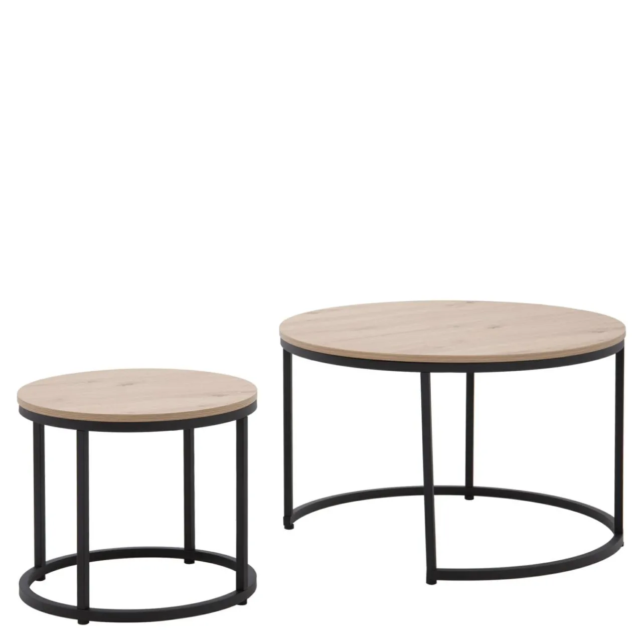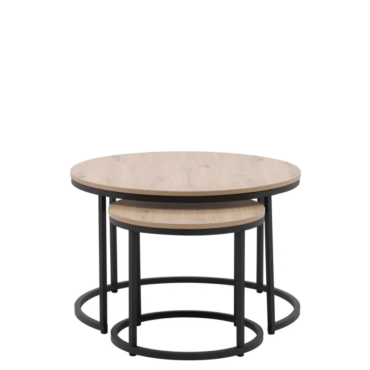 Blaty stolików zostały wykończone okleiną drewnopodobną. Rysunek sęków i słojów przypomina naturalne, jasne drewno.