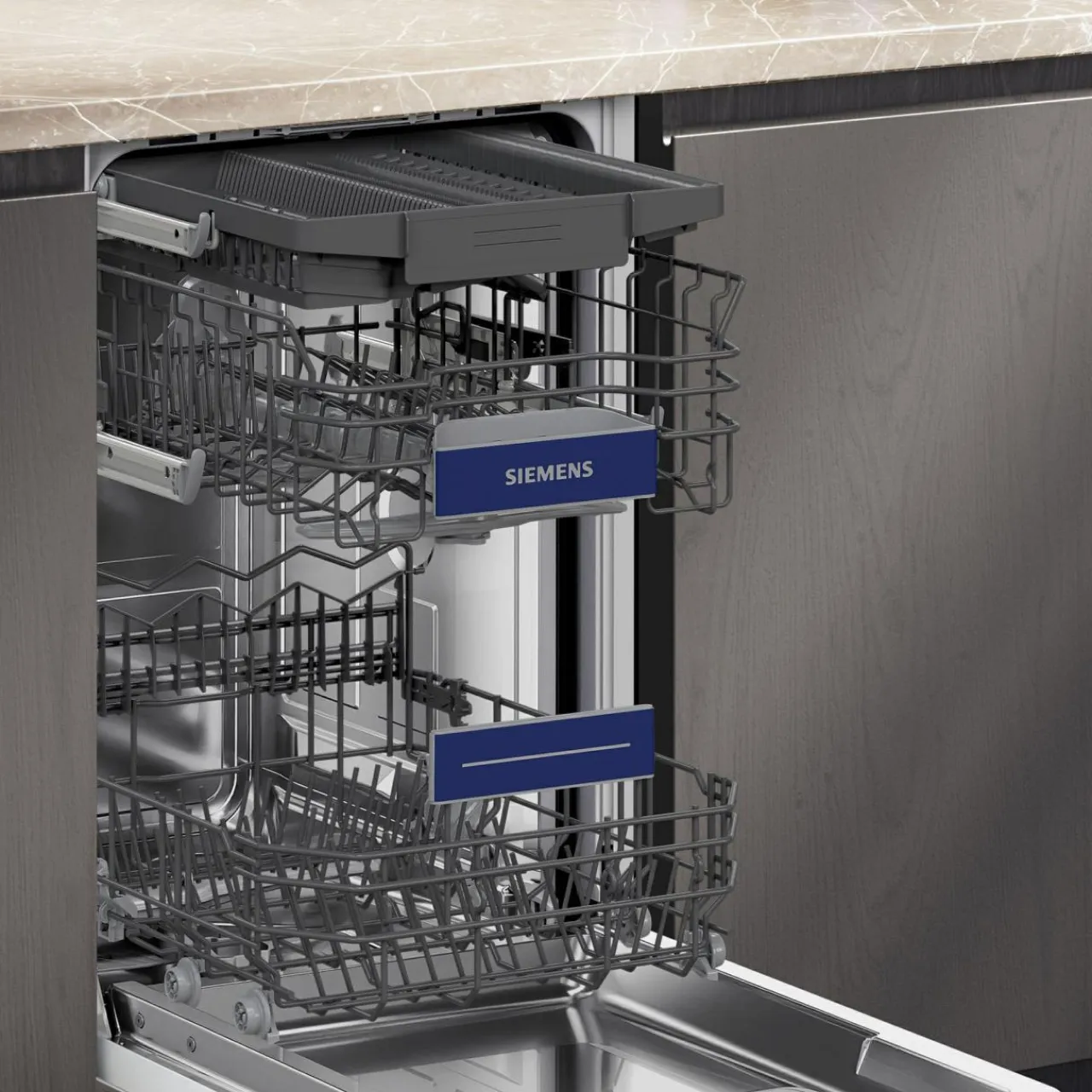 - rackMatic: 3-stopniowa regulacja wysokości górnego kosza, nawet przy pełnym załadunku.