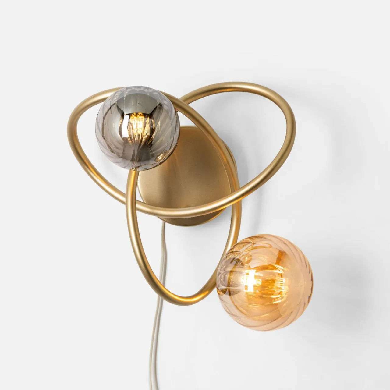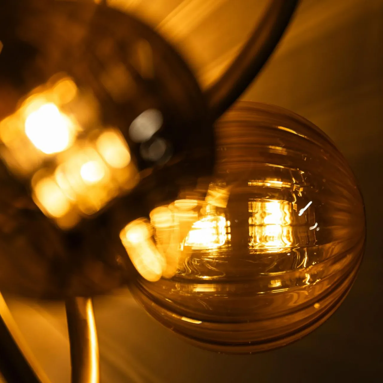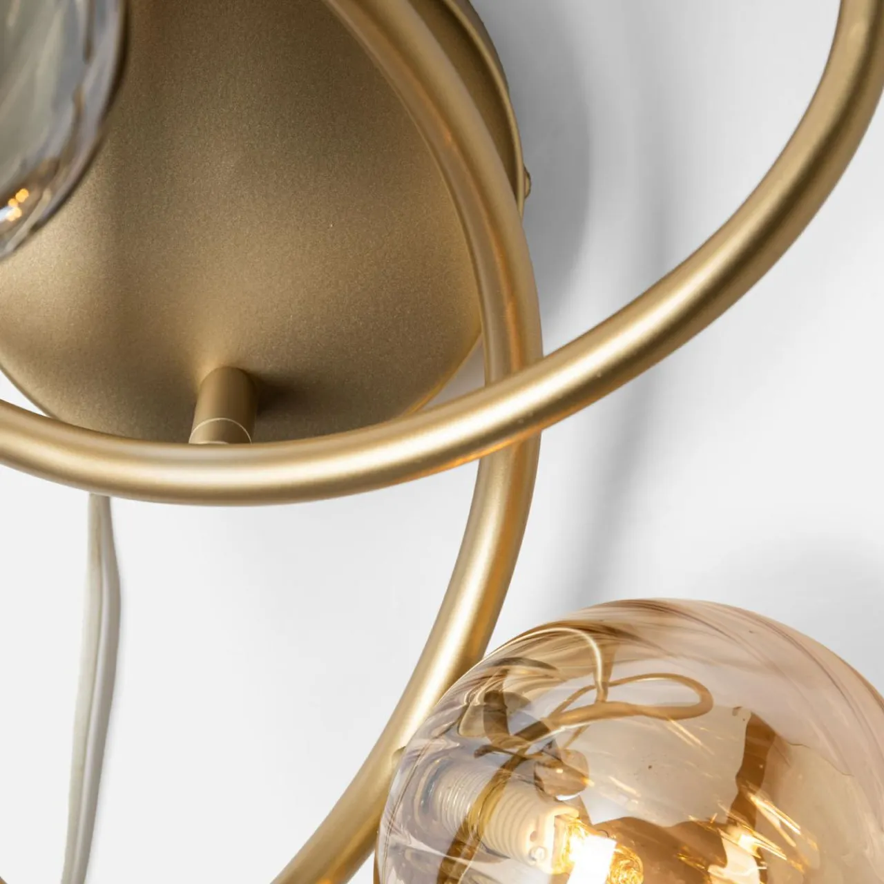 Wyróżnia go eleganckie, połyskujące wykończenie w złotym kolorze, jednak to dobór odcienia szkła w kulistych kloszach zwraca największą uwagę.