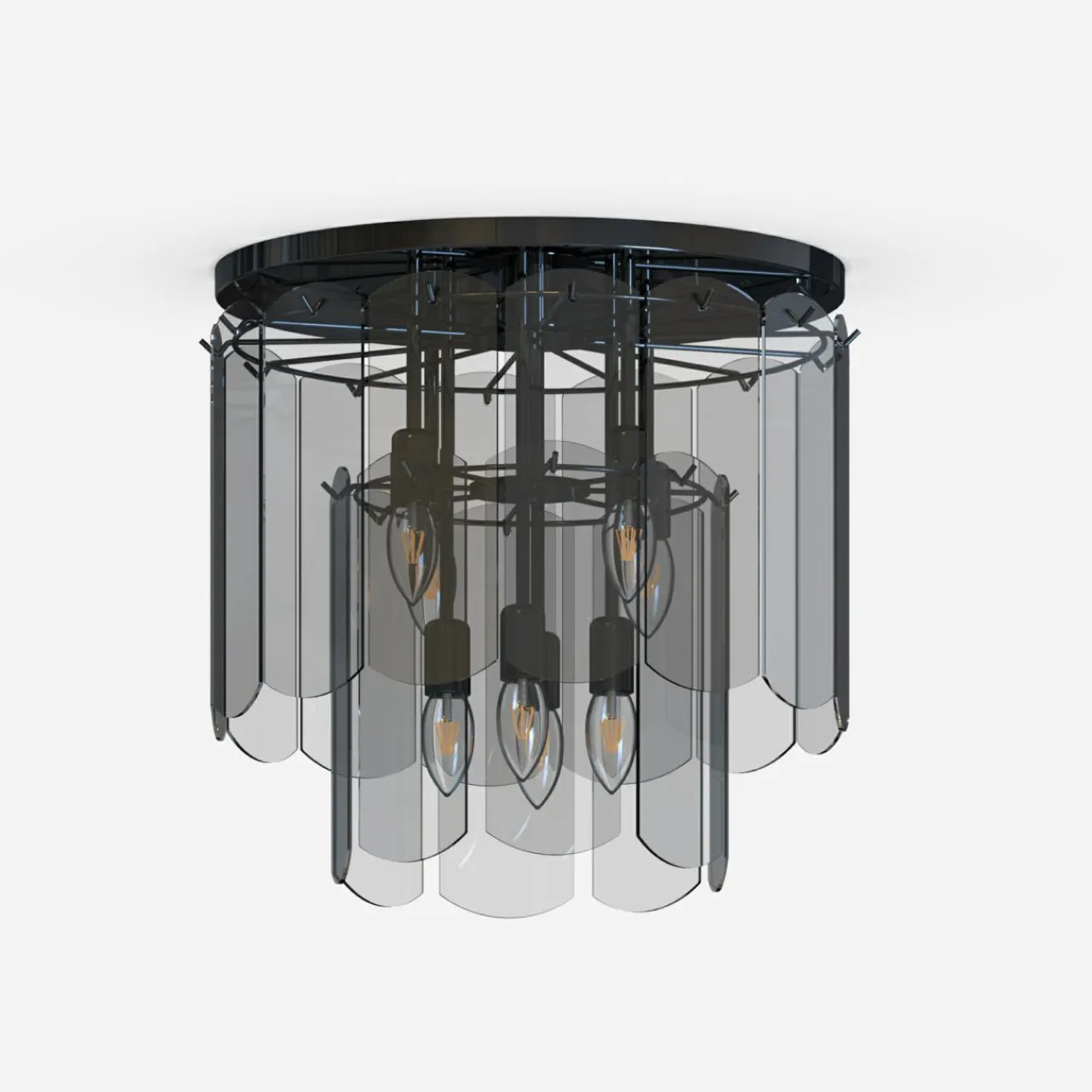 - Modny kształt lampy oparty jest ozdobach o regularnym kształcie, wykonanych z przydymionego szkła. Wykończenie lampy łączy czerń oprawy z kloszem, wewnątrz którego doskonale widać kształty żarówek.