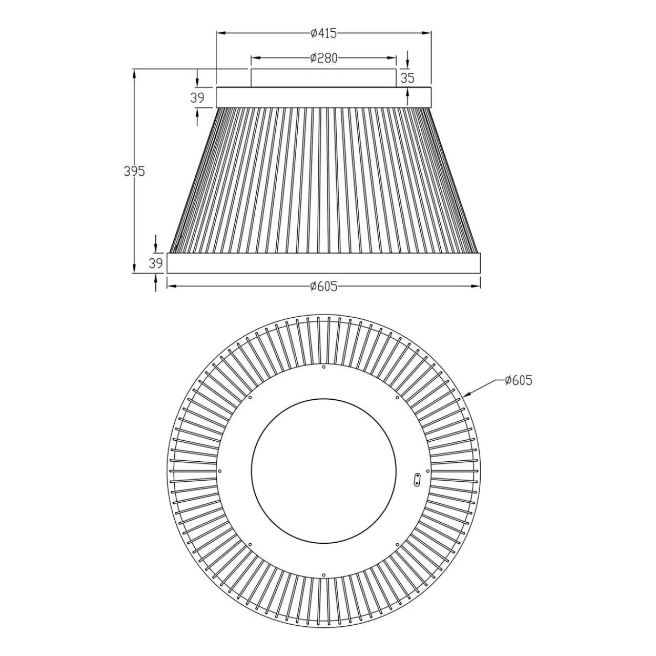 Jej oryginalny design składa się z 2 pierścieni połączonych w taki sposób, że całość przypomina abażur o kształcie trapezu. Lampa posiada wbudowane podświetlenie LED, a jej średnica wynosi 60,5 cm.