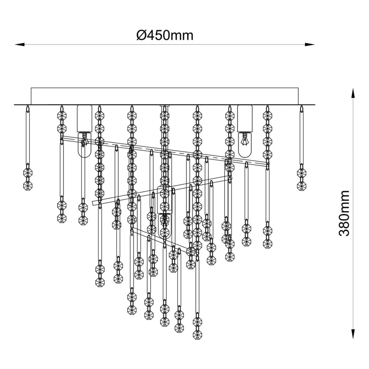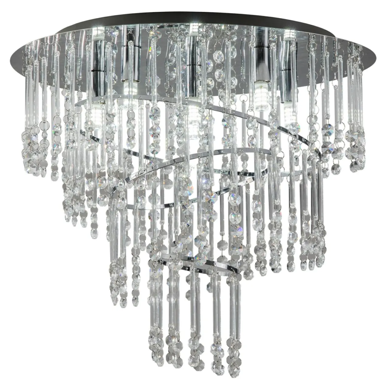Jej okrągła metalowa podstawa otoczona szklanymi kryształkami w cudowny sposób rozprasza światło, a także imponująco prezentuje sie we wnętrzach salonu, jadalni oraz pokoju dziennego. Chromowane wykończenie podkreśla połyskujący efekt jaki osiąga światło w połączeniu z błyszczącymi ozdobami.