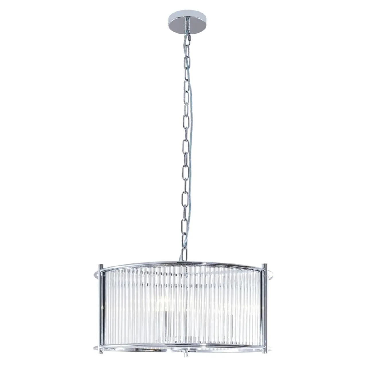 Jej klosz wkomponowany w metalową ramę został wzbogacony chromowanym wykończeniem. Wspaniale komponuje się z przestronnymi wnętrzami oraz jasnymi kolorami mebli i tapicerki.
