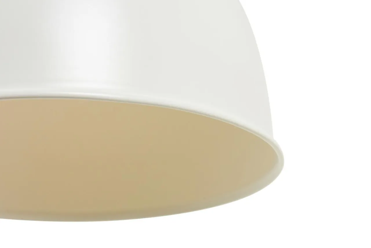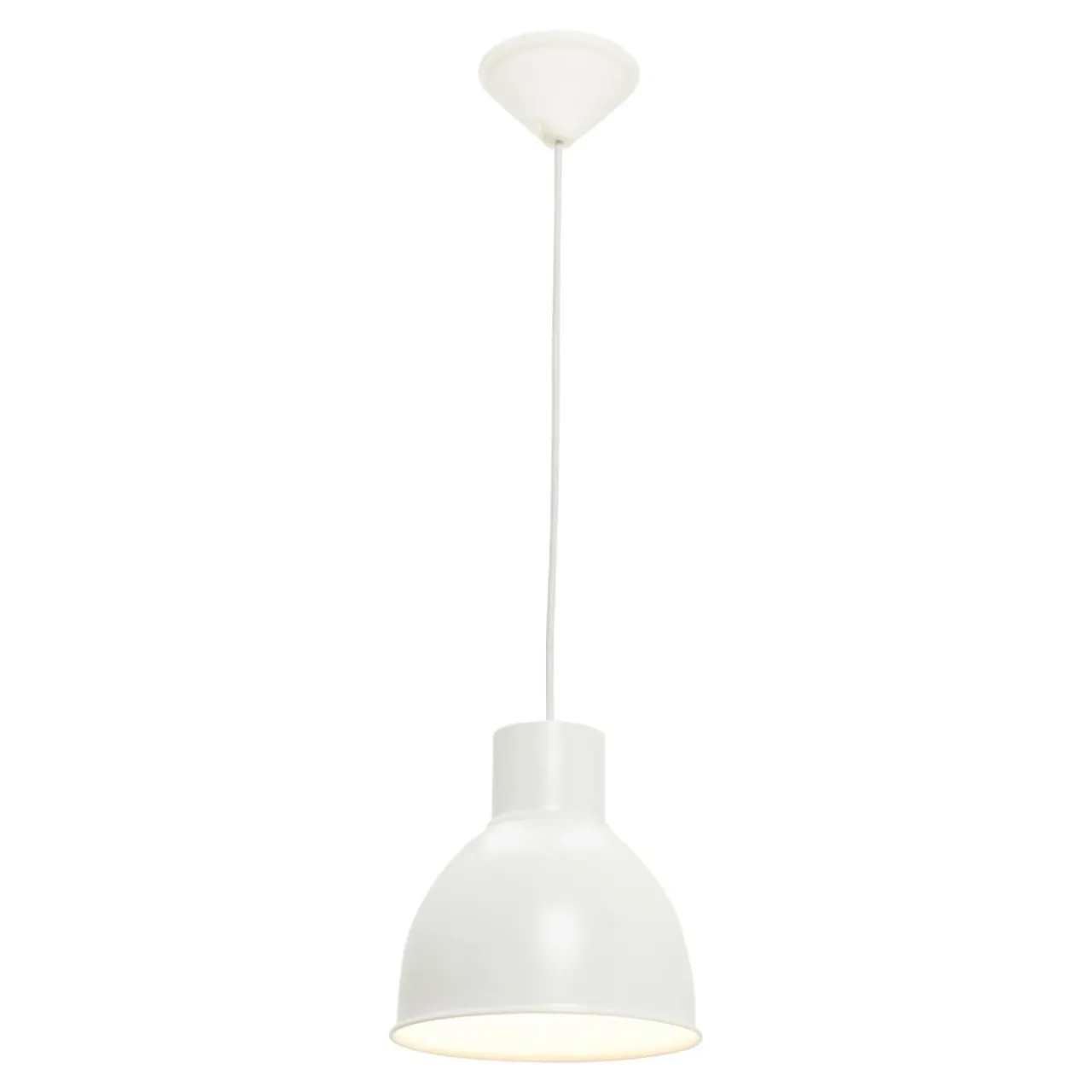 Lampa wisząca ELSTRA prezentuje prosty, funkcjonalny wzór. Podstawa mocowana przy suficie stabilizuje zawieszenie lampy, a półkolisty, biały klosz osłania oprawę żarówki.