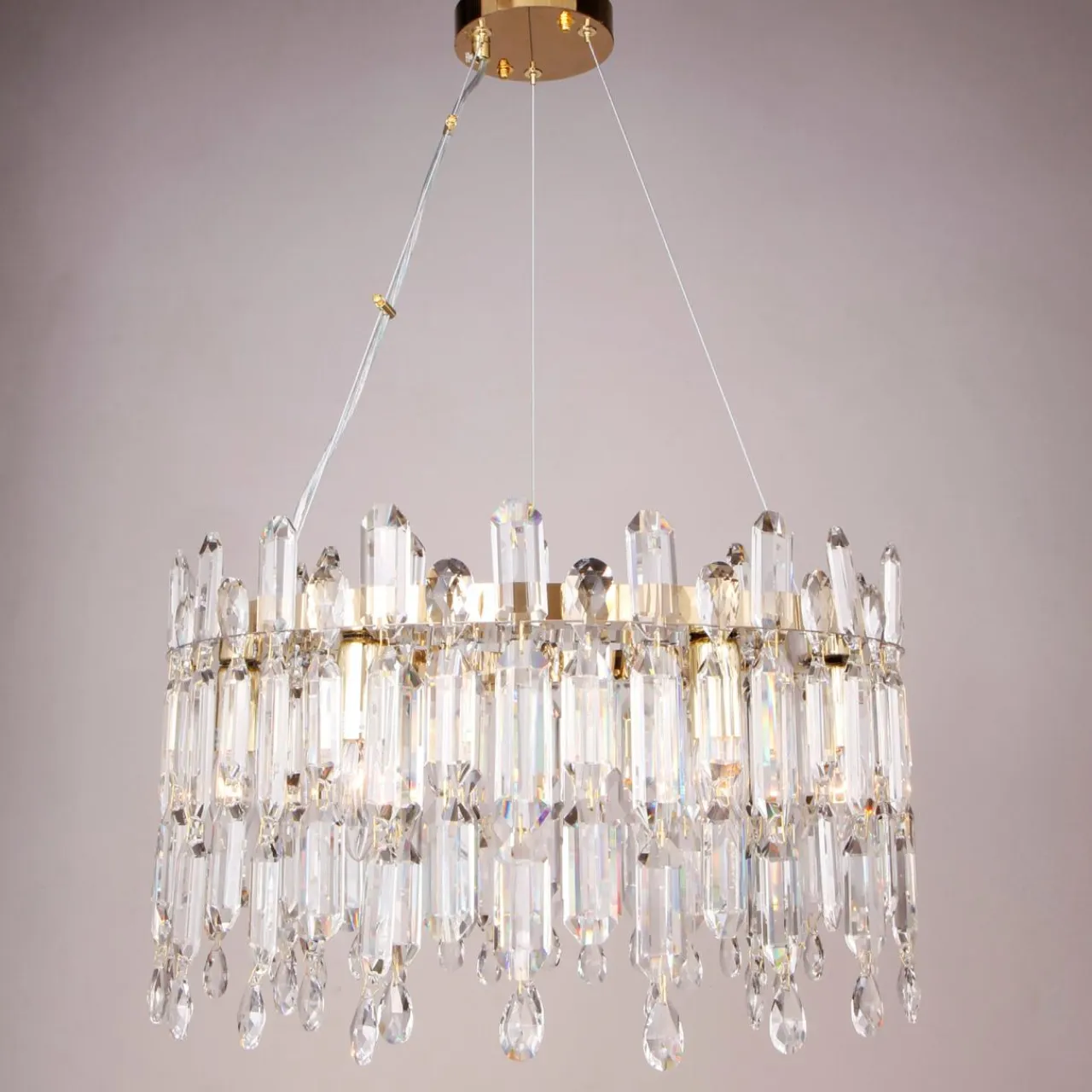 - Okrągły kształt lampy stanowi doskonały pomysł na pokazanie szklanych kryształów, które otaczają stelaż lampy.