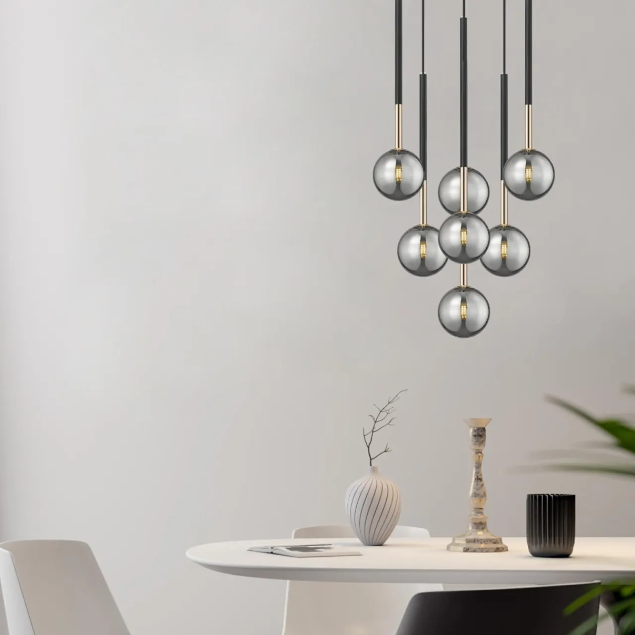 - Oprawa wykończona czarnym kolorem z ozdobnym dodatkiem francuskiego złota została dopełniona przez 7 transparentnych kloszy w odcieniu grafitu – to zestawienie dopasujesz do wnętrz, ciążących w stronę loftowej estetyki.