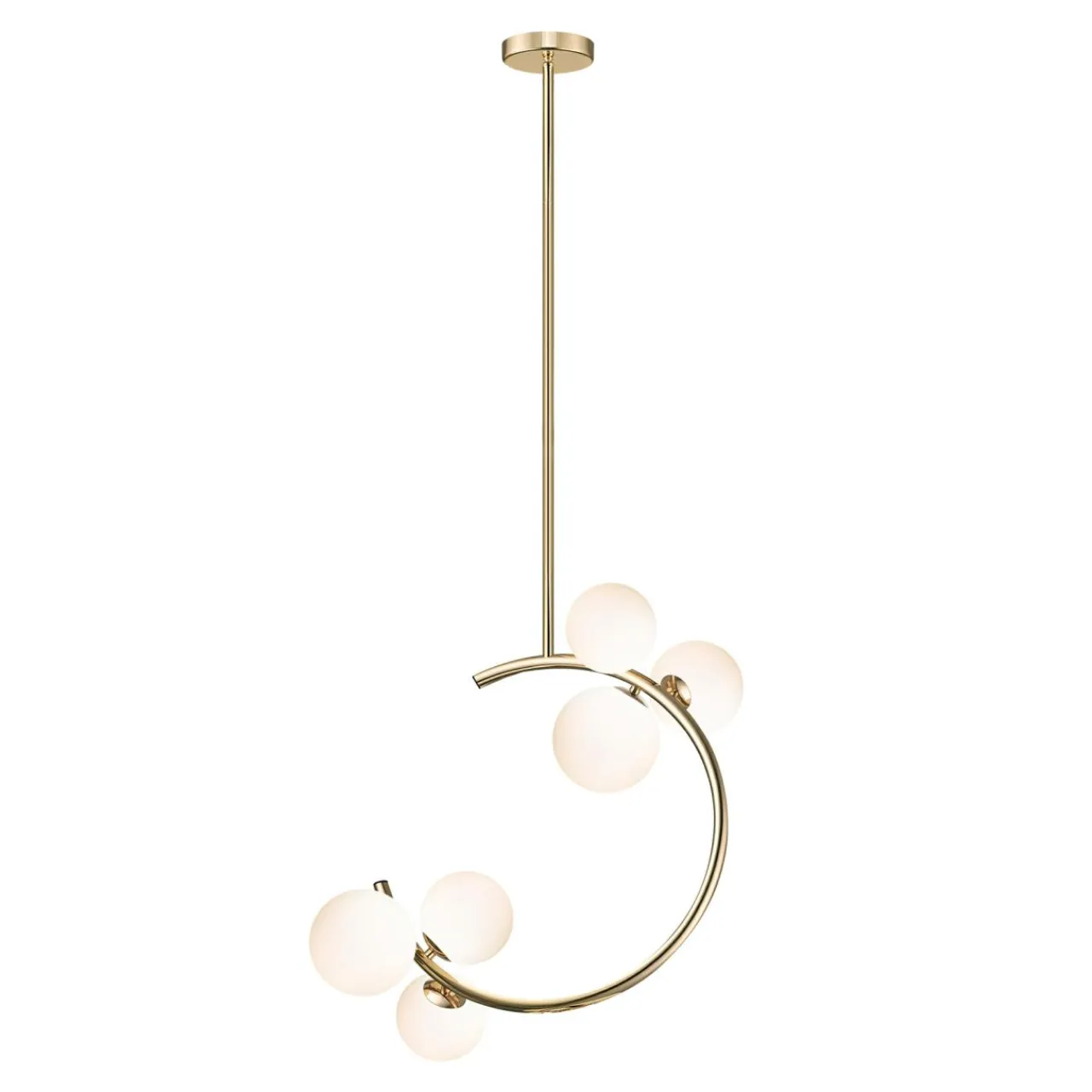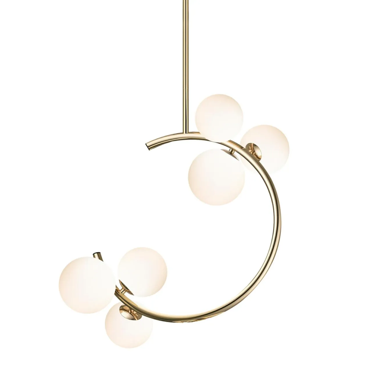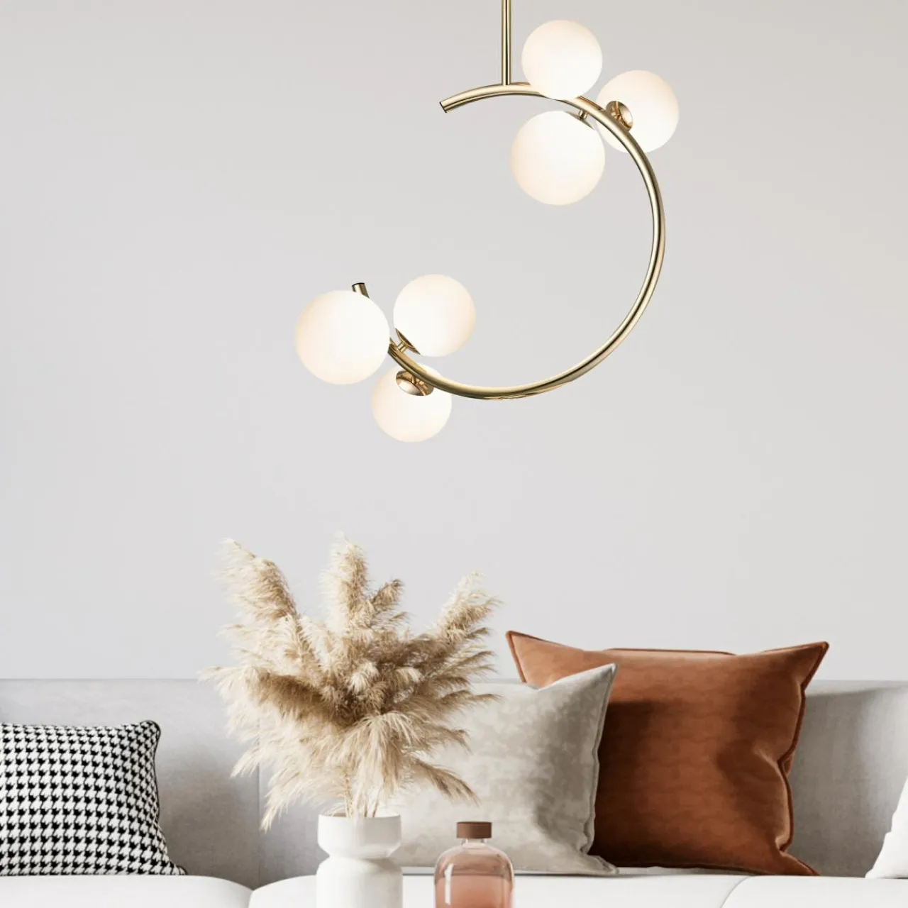Łukowaty kształt lampy MOLECULE z kulistymi kloszami łączy prostotę z łagodnym, przyjemnym dla oka wzorem, który działa kojąco i kojarzy się z relaksem i wypoczynkiem.