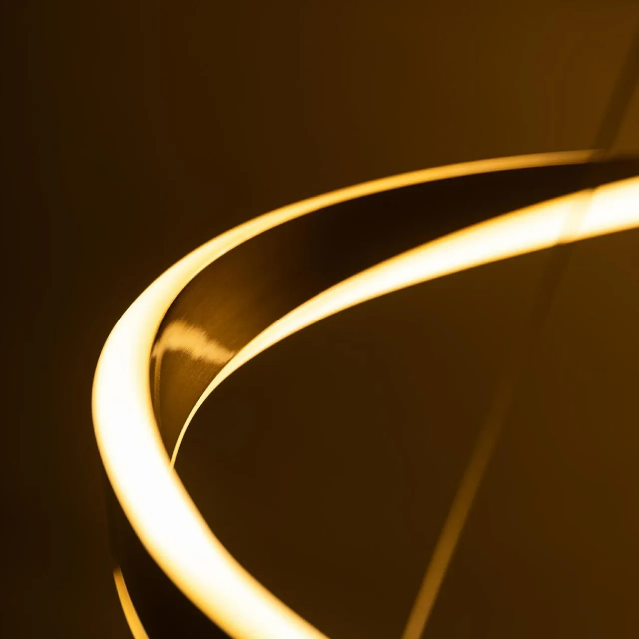 - Wykończenie wiszącej lampy GIRONA zdobi wbudowane podświetlenie LED, które wije się wokół metalowego pierścienia, przeplatając się pomiędzy jego wewnętrzną i zewnętrzną częścią.