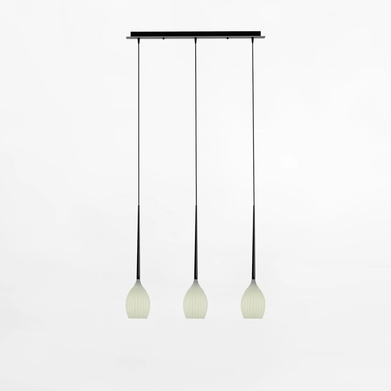 Wiszący model tej lampy zaprojektowany z myślą o wnętrzu jadalni oraz salonu posiada oprawę dla 3 żarówek, koncentrycznie rozmieszczonych wzdłuż wąskiej podstawy o kształcie listwy.
