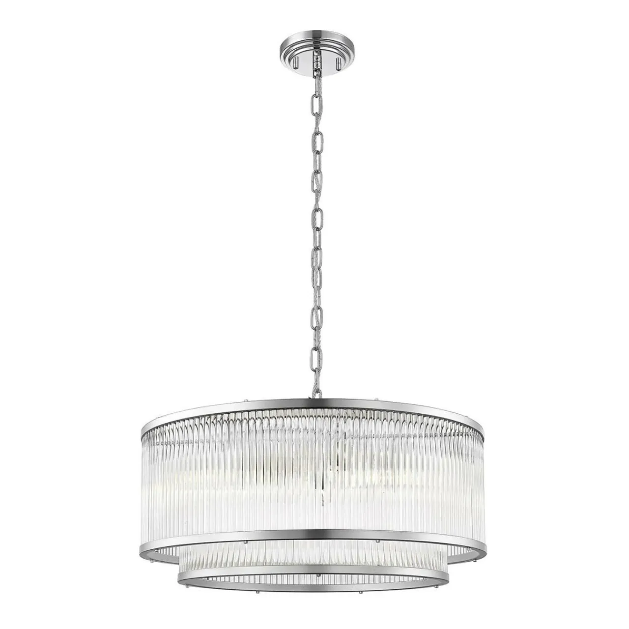 Światło sześciu żarówek umieszczonych wewnątrz klosza w urokliwy sposób reaguje ze szklaną powierzchnią, a dodatkowego czaru tej kompozycji dodaje chromowane wykończenie.