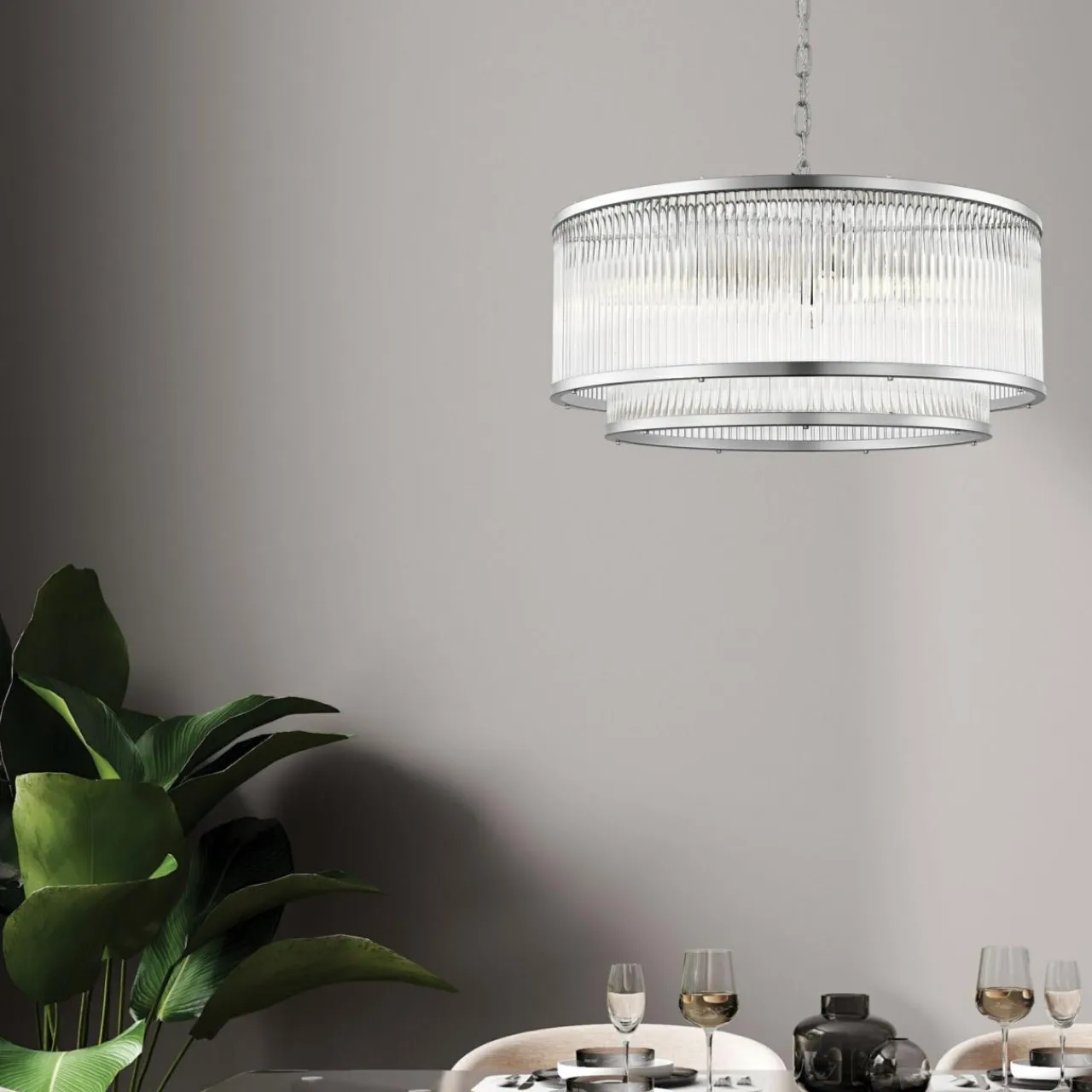 Jej podwójny szklany klosz wkomponowany w metalowe obramowanie i wzbogacone chromowanym wykończeniem, podkreśla nowoczesną stylistykę wnętrza. Wspaniale komponuje się z jasnymi kolorami. Jest również wysmakowanym dodatkiem, który wzbogaca pomieszczenie o odrobinę szyku oraz elegancji. Średnica 50 cm sprawia, że najpełniej prezentuje się właściwie wyeksponowany w przestronnych wnętrzach. Dodatkowym elementem ozdobnym jest łańcuch, który łączy klosz z podsufitką.