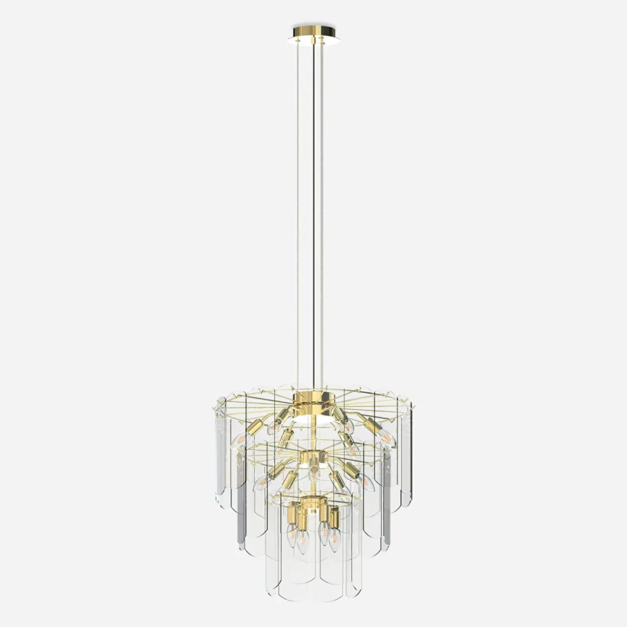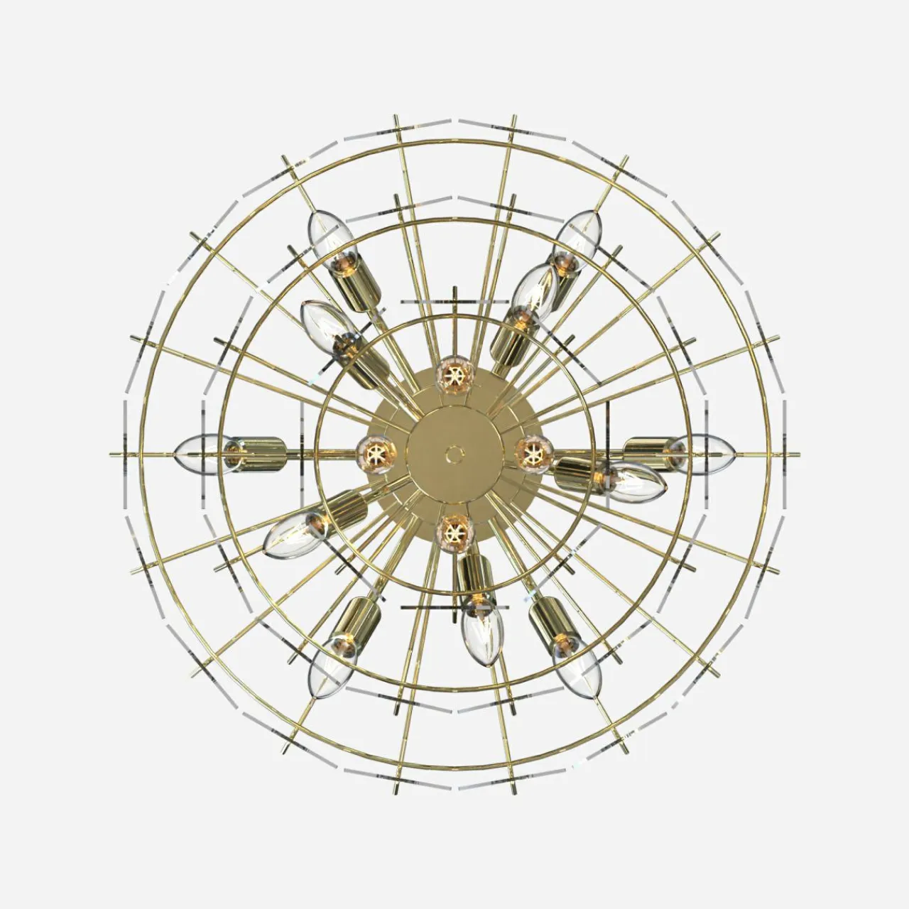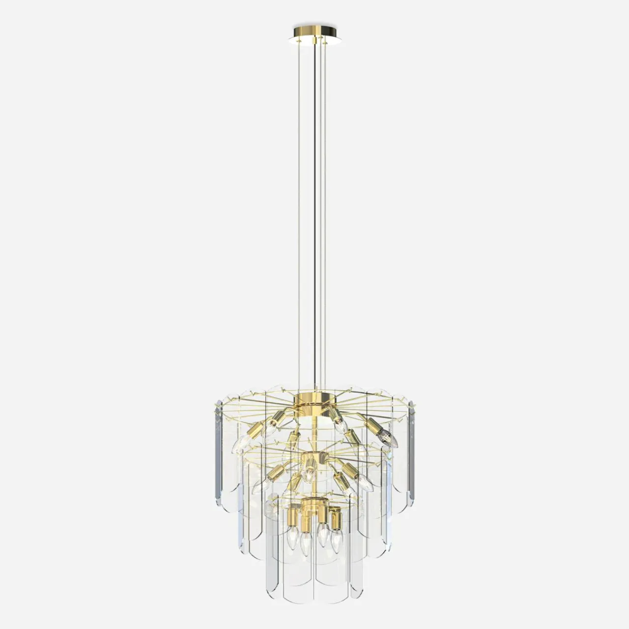 - Modny kształt lampy oparty jest ozdobach o regularnym kształcie, wykonanych z transparentnego szkła. Wykończenie lampy łączy złoto oprawy z kloszem, wewnątrz którego doskonale widać kształty 14 żarówek.