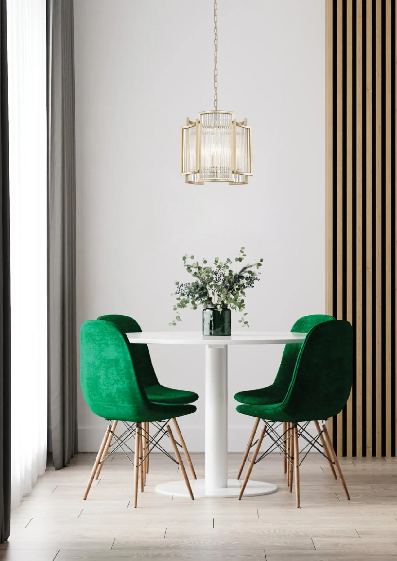 Jej szklany klosz wkomponowany w metalową ramę i wzbogacony matowym, złotym wykończeniem podkreśla nowoczesną stylistykę wnętrza oraz wspaniale komponuje się z jasnymi kolorami. Jest wysmakowanym dodatkiem, który wzbogaca pomieszczenie o odrobinę szyku oraz elegancji.