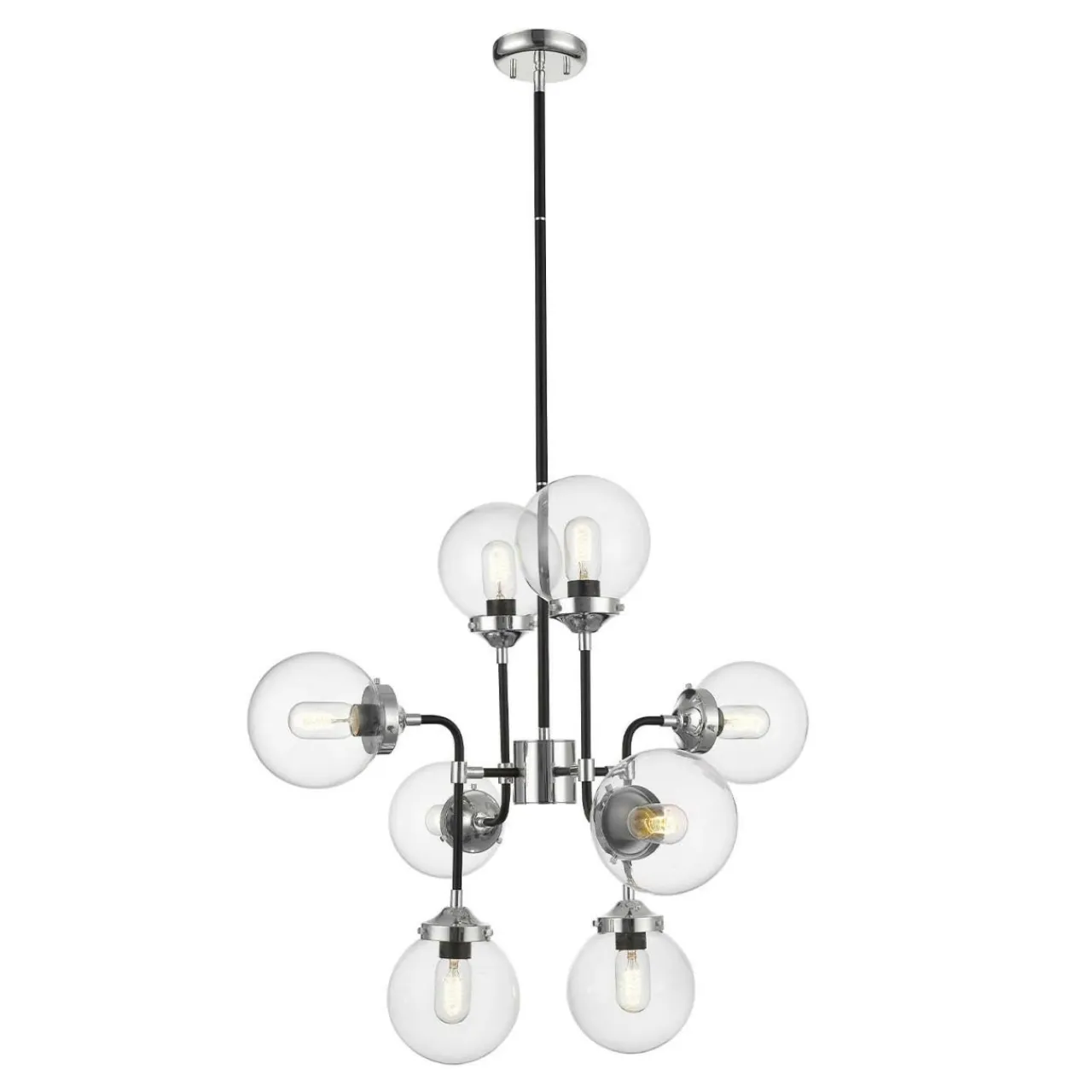 Rozbudowana podstawa lampy powstała z połączonych ze sobą drążków, z których każdy został zwieńczony niewielkim kloszem z przejrzystego szkła. Dzięki nim lampa doskonale prezentuje się z ozdobnymi żarówkami, które swoim kształtem dodatkowo podkreślają jej walory estetyczne i dekoracyjne.