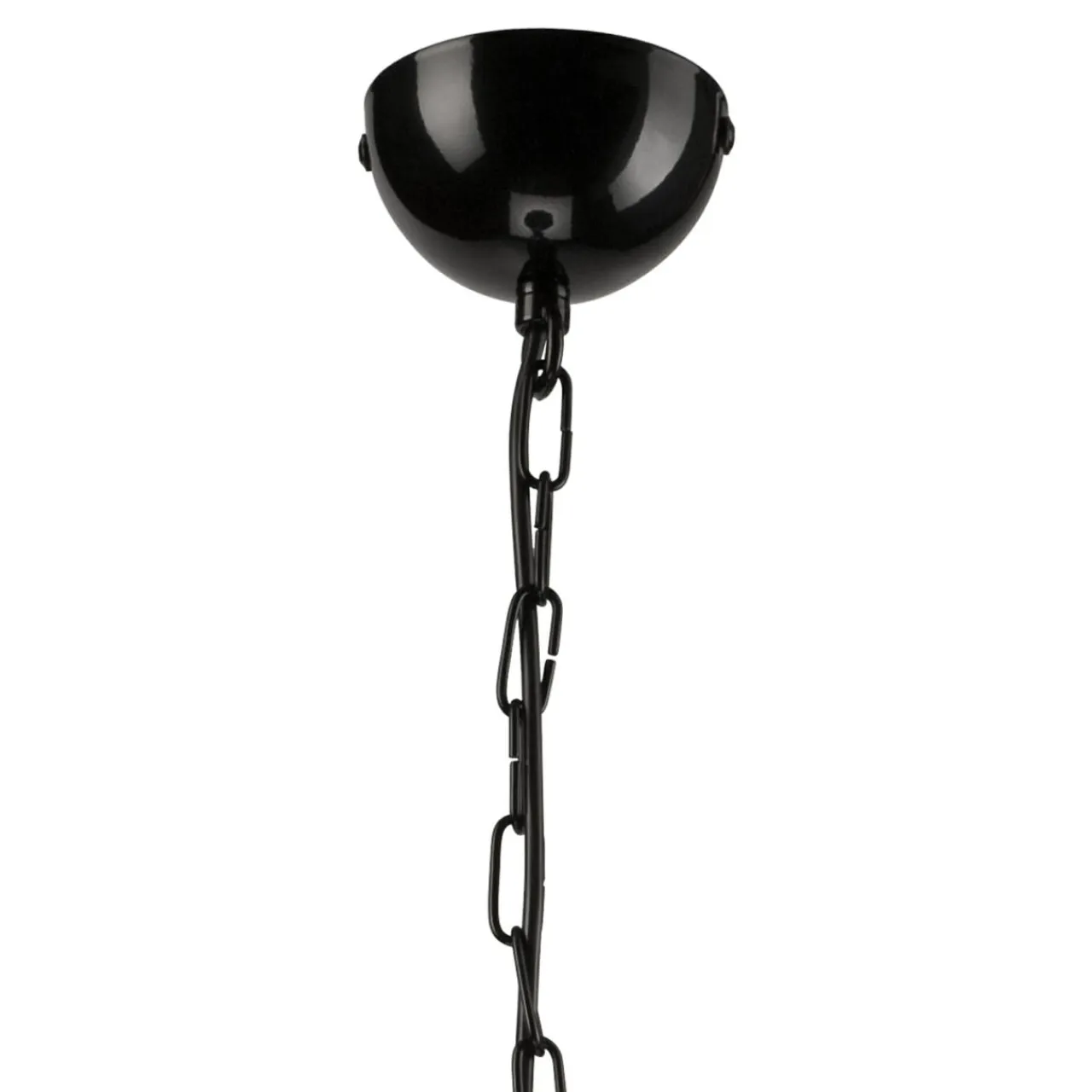 Czarne wykończenie lampy lekko błyszczy w świetle, a jednolity kolor bazy i ozdobny łańcuch podkreśla metaliczny odcień miedzi przy oprawie żarówki.